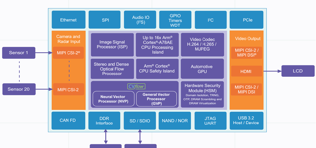 安霸CV3-AD是一款高性能的汽車AI芯片,最高包括了16核心的Coretex-A78AE,具有極高的CPU算力。同時,它也通過了ASIL-B級認證,這意味著它具有高度的可靠性和安全性。在AI算力方面,安霸CV3-AD等效于500TOPS,表現(xiàn)出色。